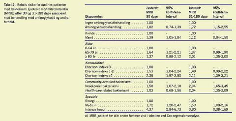 Infektionsfocus var af betydning for associationen mellem AG-behandling og 30-dages-mortalitet. AG-behandling var således associeret med nedsat mortalitet for patienter med urinvejsfocus (justeret MRR: 0,48; 95% KI: 0,22-1,08) og patienter med abdominalt focus (justeret MRR: 0,52; 95% KI: 0,24-1,10), men med forhøjet mortalitet for patienter med et respiratorisk focus (justeret MRR: 2,06; 95% KI: 0,93-4,53). Vi fandt en favorabel 30-dages-prognose associeret med AG-behandling blandt bakteriæmier forårsaget af gramnegative stave og Staphylococcus aureus, men en ugunstig prognose ved AG-behandling af pneumokokbakteriæmi (justeret MRR: 2,99, 95% KI: 0,96-9,39). Overordnet var 30-dages-mortaliteten blandt AG-behandlede patienter tæt på non-AG-behandlede patienters, uanset om begge antibiotika i kombinationen var dækkende (justeret MRR: 0,97), eller om dækningen afhang af AG alene (justeret MRR: 0,92). Heller ikke varigheden af AG-behandling havde væsentlig betydning for mortaliteten.