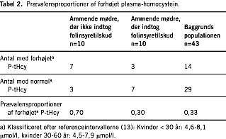 Resultater: Gruppen af ammende mødre, der ikke indtog folinsyretilskud, havde en højere prævalens af forhøjet plasma-homocystein (70%) end gruppen af ammende mødre, der indtog folinsyretilskud (30%), og baggrundspopulationen (33%). Forskellen mellem gruppen af ammende mødre, der ikke indtog folinsyre, og gruppen af ammende mødre, der indtog folinsyre, var ikke signifikant (p=0,12). Der var signifikant forskel mellem gruppen af ammende mødre, der ikke indtog folinsyre, og baggrundspopulationen (p=0,02).