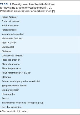 Amnionvæskeemboli (AVE) er en uforudsigelig og alvorlig obstetrisk komplikation, der trods en incidens på 7-8 pr. 100.000 fødsler er blandt de hyppigste årsager til maternel mortalitet i industrialiserede lande, med en mortalitetsrate på 13,8-60% [1, 2].Tilstanden debuterer hyppigst under fødslen eller umiddelbart postpartum [1].
