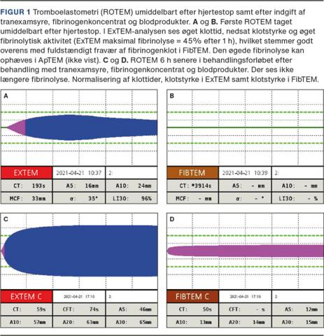 Efter 9 min HLR var spontan cirkulation reetableret (ROSC), men i 5 min persisterede svær hypoksi trods intubation og ventilation med 100% O2. En ekkokardiografi 5 min efter ROSC gav mistanke om lungeemboli med belastning af højre ventrikel. Der var normal funktion af venstre ventrikel. Samtidig forelå der udbredt, diffus blødningstendens fra alle overflader i abdomen og fra stikkanaler, profus blødning fra vagina samt uterusatoni, og man afstod fra trombolyse. Der opstod mistanke om dissemineret intravaskulær koagulation, tromboelastometri (ROTEM) viste svær fibrinogenmangel og tegn til både hyperfibrinolyse og forbrugskoagulopati (Figur 1). Tilsvarende fandtes høj D-dimer (> 35,2 mg/l), svært forlænget aktiveret partiel tromboplastintid (92 s) og et markant fald i trombocytniveauet. Substitution med blodkomponenter og fibrinogen blev iværksat. Man forsøgte carboprost, oxytocin og methylergometrin mod uterusatoni, men da der fortsat var massiv, ukontrollabel blødning, foretog man på vital indikation hysterektomi, der pga. svære operationsforhold med pågående diffus blødning samt adhærencer mellem uterus, begge adnekserne og tarmen måtte gøres subtotal. Pga. fortsat siveblødning gav man tranexamsyre og ilagde dræn.