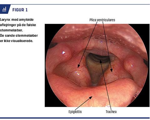 Laryngeal amyloidose (LA) er sjældent forekommende og udgør kun 0,2-1,2% [1, 2] af de benigne tumorer i larynx. LA er som regel en lokaliseret sygdom, men kan også ses som del i systemisk amyloidose. Incidensen er højest hos personer i alderen 40-60 år med overvægt hos mænd [2].