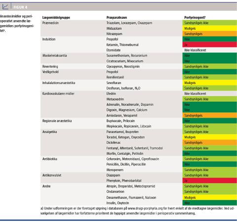 I Figur 4 angives nogle hyppigt anvendte lægemidler under den perioperative fase. Lægemidlerne, der er udvalgt af artiklens forfattere, er kategoriseret efter principperne fra [11]. For alle lægemidler i figuren er der foretaget søgning i databasen i forhold til en patient med »sandsynlig følsomhed«. Lægemidler, der er markeret med grøn og lysegrøn, kan altså trygt anvendes til en operationspatient med genetisk disposition for akut porfyri [11, 10]. Ad benzodiazepiner: Man har tidligere fejlagtigt antaget, at disses porfyrinogenitet var samstemmende for hele gruppen på linje med barbiturater [3, 11]. Der vides nu at være stor variation imellem benzodiazepiners porfyrinogenitet [2, 11].