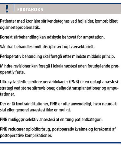 I takt med udbredelsen af ultralydvejledte perifere nerveblokader (PNB) er der nu flere muligheder til rådighed for at sikre selektiv anæstesi til større sårrevisioner, delhudstransplantationer og amputationer. Formålet med denne strategi er at skåne den ofte ældre svækkede patient for postoperative komplikationer [3].