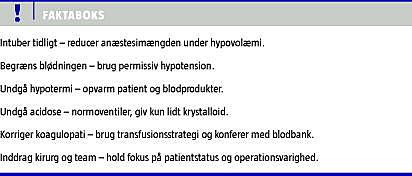 - Penninga L, Penninga EI, Svendsen LB. Damage control surgery hos multitraumatiserede patienter. Ugeskr Læger 2005;167:3403-7.