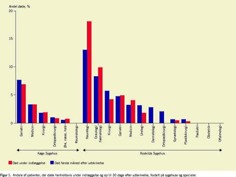 Materiale og metoder: Vi har identificeret samtlige dødsfald, som indtrådte under eller op til en måned efter udskrivelse hos patienter, der var indlagt på Roskilde eller Køge Sygehus, og har registreret oplysninger om alder, indlæggelsesmåde, indlæggelsesvarighed, udskrivende stamafdeling og aktionsdiagnose.
