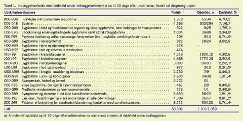 Resultater: Ud af 50.302 indlæggelsesforløb endte 2,2% med dødsfald under indlæggelsen, mens 2,1% af de udskrevne døde inden for den første måned efter udskrivelsen. Under indlæggelsen var andelen af dødsfald 1,1% blandt elektivt og 2,6% blandt akut indlagte patienter. Cancersygdomme, infektionssygdomme, kredsløbssygdomme og åndedrætssygdomme var relateret til den højeste andel af dødsfald under indlæggelse. I flere diagnosegrupper var risikoen for at dø i den første måned efter udskrivelsen højere end risikoen for at dø under indlæggelsen. Pneumoni var den hyppigste benigne diagnose for såvel dem, der døde under indlæggelse, som dem, der døde i måneden derefter. Det relative antal af dødsfald var stigende med stigende antal indlæggelsesdage.