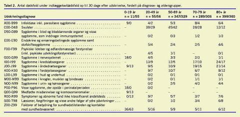 I nogle diagnosegrupper er der en forventelig høj dødelighed, f.eks. inden for »cancere og andre svulster«, både under og efter udskrivelsen (Tabel 1). Men vi fandt også, at der i den første måned efter udskrivelse inden for diagnosegrupperne »Sygdomme i blod og bloddannende organer og visse sygdomme, som inddrager immunsystem« og »Endokrine og ernæringsbetingede sygdomme samt stofskiftesygdomme« døde flere i måneden efter udskrivelse end under selve indlæggelsen.