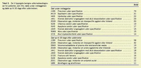 De ti hyppigste benigne aktionsdiagnoser i forløb med dødsfald inden for den første måned efter udskrivelsen fremgår af sidste del af Tabel 3. Disse diagnoser var knyttet til 223 dødsfald eller 21,1% af i alt 784 dødsfald hos patienter med en benign udskrivelsesdiagnose. Det fremgår af tabellen, at diagnoserne »Pneumoni uden specifikation« og »Obs. på grund af mistanke om ikkespecificeret sygdom eller tilstand« var forbundet med flest dødsfald efter udskrivelsen.