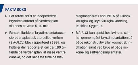 Da man blev opmærksom på en mulig sammenhæng mellem ALCL og brystimplantater, blev der udført et dansk populationsbaseret kohortestudie med 19.885 patienter, der i perioden 1973-2010 havde fået indopereret ét eller to brystimplantater af enten rekonstruktiv eller kosmetisk grund. Der blev ikke fundet nogen tilfælde af BIA-ALCL [11]. Efterfølgende er der rapporteret om tre danske tilfælde, hvoraf det seneste forekom i april 2015 [12].