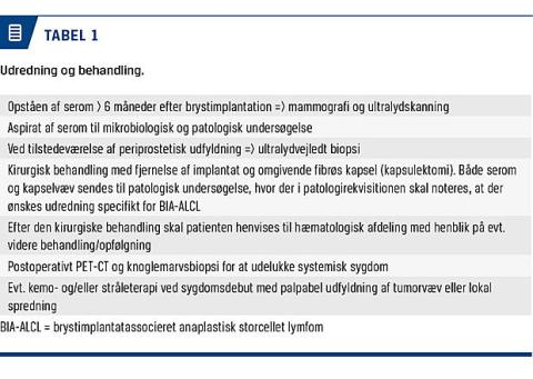 Patienter med BIA-ALCL har ofte uspecifikke symptomer, som kan opfattes som almindelige implantatrelaterede komplikationer, såsom infektion med seromdannelse. Der er derfor risiko for, at en mangelfuld opmærksomhed på sygdommen kan resultere i forsinket diagnose og behandling. Vi har derfor fundet det relevant at præsentere en gennemgang af litteraturen på området og formidle anbefalinger for udredning, behandling og opfølgning af denne sjældne kliniske entitet.