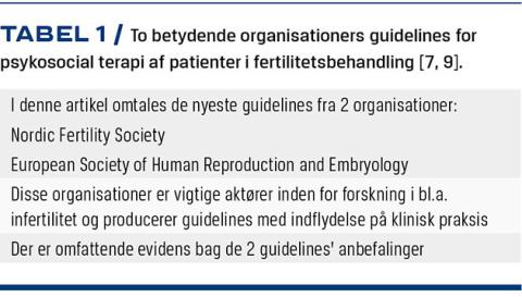 Nordic Fertility Society (NFS) har primært produceret deres anbefalinger på baggrund af nordiske og europæiske studier, mens European Society of Human Reproduction and Embryology (ESHRE) har global og europæisk forskning som evidens (Tabel 1) [7, 9, 25, 26]. Dette kan være medvirkende til, at de to guidelines især adskiller sig på anbefalinger, der kræver særligt personale. I NFS-guidelinen sammenkobles psykosociale gruppebaserede interventioner med fokus på undervisning og udvikling af kompetencer f.eks. inden for coping med lavere niveauer af angst og depressive symptomer [7]. Dette understøttes også af et systematisk review fra 2015 [27]. Modsat underbygges det af andre internationale studier i ESHRE-guidelinen, at det er usandsynligt, at tilsvarende psykosociale interventioner vil bedre patienternes relationelle, emotionelle og kognitive tilstande [9].