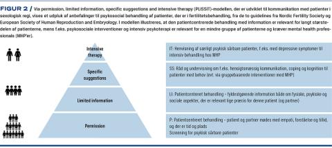 Den patientcentrerede behandling angives som værende meget vigtig for patienterne og associeres også med øget trivsel og lavere niveauer af angst og depression i begge guidelines og supplerende litteratur [7, 9, 29]. En patientcentreret behandling indebærer fokus på og respekt for patienten og i fertilitetsbehandling også patientens partners værdier, holdninger og følelser. Parret skal involveres i beslutningsprocesser, hvilket kræver fyldestgørende information om både det fysiske og psykiske aspekt af behandlingen, og forløbet skal være kontinuert, professionelt og helst håndteres af færrest mulige behandlere (Figur 2) [30]. Den patientcentrerede behandling læner sig op ad et biopsykosocialt behandlingsgrundlag. Patienten hjælpes ikke kun med afsæt i medicinske og fysiologiske forhold, men også med opmærksomhed på menneskets helhed, hvor sociale, psykiske og fysiske forhold er uløseligt forbundet og vekselvirkende med hinanden. Historisk set har den biomedicinske model, hvor patientens sygdom opfattes som biologiske fejl eller afvigelser, som må opdages og korrigeres, været grundlaget for sundhedsfaglig behandling. Derfor kræver en patientcentreret behandling et grundlæggende skift og øget viden og kompetenceudvikling blandt hele personalegruppen, men ikke nødvendigvis fastansættelse af MHP’er.