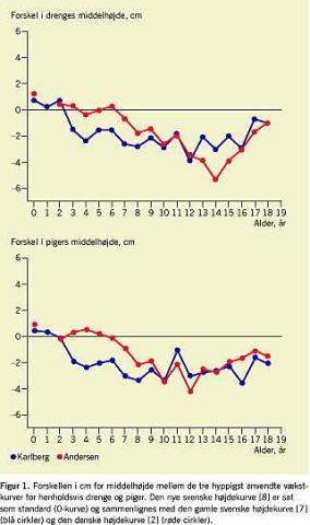 Karlberg et al [7] publicerede i 1976 vækstkurver fra en kohorte af 212 børn (122 drenge), der var blevet fulgt longitudinelt fra fødslen i perioden 1955-1958 til de var udvoksede i perioden 1971-1974. Børnene kom fra Solna (nordlig forstad til Stockholm), der med hensyn til socioøkonomiske forhold var repræsentativ for svenske byområder. Børn med kroniske sygdomme blev ekskluderet. Kurverne oplyser middelværdierne for højde og vægt samt standarddeviationer (SD) fra -3 SD til +3 SD. Else Andersen et al [2] publicerede i 1982 vækstkurver på et tværsnitsmateriale bestående af 11.000 danske børn (5.500 drenge), der i 1971-1972 var 7-18 år, og 2.665 børn, der i perioden 1973-1977 var i aldersintervallet 0-6 år. Den sociale fordeling var som i befolkningen i almindelighed. Kronisk syge børn og ikkekaukaside børn blev ekskluderet. Kurverne oplyser middelværdierne for højde og vægt samt percentiler. Sammenlignet med et 30 år ældre dansk materiale var drenge 4,2 cm og piger 3,7 cm højere ved sluthøjde [2].