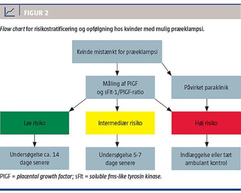 En dobbelt skæringsværdi, som Verlohren et al [11] opstiller, synes at tilfredsstille ønsket om en høj sensitivitet og specificitet. Kvinderne inddeles således i tre grupper på baggrund af deres resultater (Figur 2): 1) En lavrisikogruppe, som vil kunne vente til næste graviditetsundersøgelse omkring to uger senere, 2) en intermediær gruppe, som, hvis resultaterne af en paraklinisk undersøgelse ikke er patologiske, skal komme til ambulant besøg noget oftere, f.eks. hver 5.-7. dag, og 3) en højrisikogruppe, som indlægges eller følges tæt ambulant.