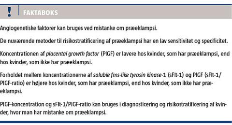 I de seneste år har flere studier vist en sammenhæng imellem de pro- og antiangiogenetiske faktorer og præeklampsi [1, 3, 7]. Disse proteiner omfatter blandt andre placental growth factor (PlGF) og soluble fms-like tyrosin kinase 1 (sFlt-1).
