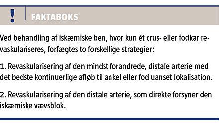 forandrede kar uanset lokalisation« til fordel for angiosomrettet revaskularisering. Den kendsgerning, at forskellen mellem resultaterne af direkte og indirekte revaskularisering er størst hos patienter med inficerede sår og hos patienter med uræmi, tyder på, at forhold som ødem, mikroabscesser og mikroangiopati kan hæmme dannelsen og effekten af kollateraler, som ellers ville gøre afgrænsningen mellem angiosomerne mindre betydningsfuld.