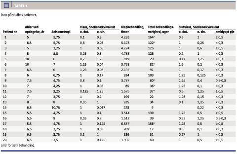 Inklusionskriterierne var børn, der var i alderen ≥ 5 år og i årene 2004-2011 var blevethenvist til Øjenafdelingen med grov amblyopi (visus 0,05-0,2) med eller uden esofori/tropi, der skyldtes svær anisometropi > 3 dioptrier. Eksklusionskriterierne var al anden øjenpatologi. Der blev foretaget en deskriptiv analyse. SPSS blev benyttet som statistisk program.