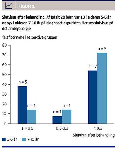 Der er en tendens til, at færre ældre end yngre børn opnår et godt behandlingsresultat (Figur 1). Den lavere grad af visusforbedring hos de ældre hænger blandt andet sammen med det totale antal timers klapbehandling, hvor de ældre har haft sværere ved at gennemføre den ordinerede mængde okklusion, dvs. opretholde en god komplians, hvilket er afgørende for et godt behandlingsresultat. Dette er også i overensstemmelse med anden nyligt publiceret litteratur på området [4].