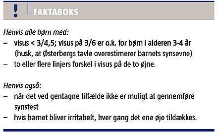 motivere forældrene til at komme til børneundersøgelserne, hvor der ved tre-, fire- og femårsundersøgelserne bliver foretaget en regulær synsundersøgelse, og hvor synstestene altid foregår monokulært med total tildækning af det andet øje.