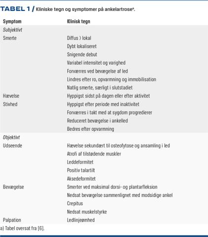 Ankelartrose kan inddeles i primær, sekundær (reumatoid artritis og andre inflammatoriske ledsygdomme, hæmokromatose, hæmofili og postinfektiøs sygdom) og posttraumatisk artrose. Over 70% af tilfældene er på posttraumatisk baggrund, mens primær og sekundær artrose forekommer tilnærmelsesvis lige hyppigt [5]. Artrosen progredierer oftest til slutstadiet 10-20 år efter læsionens opståen [5]. De hyppigste gener og objektive fund ses i Tabel 1.