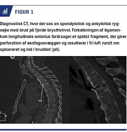 efter traumet blev hun via egen læge indlagt på den lokale medicinske afdeling til observation for pneumoni. Hun havde efter ulykken været immobil og sengeliggende pga. smerter fra columna cervicalis og thoracalis. Ved indlæggelsen var hun let konfus, men afebril, og man havde mistanke om pneumoni. Infektionstallene var forhøjede med et C-reaktivt proteinniveau på 2.643 nmol/l og et leukocytniveau på 24,2 mia./l. En ny røntgenoptagelse af columna cervicalis viste ingen tegn til fraktur. En ny røntgenoptagelse af thorax viste et mindre infiltrat på højre side. Trods intravenøs indgift af antibiotika faldt saturationen, og infektionstallene steg. Fem dage efter fik hun hævelse på halsen og respirationsbesvær. Der blev rejst mistanke om tyroiditis. Ved en ultralydskanning af halsen påvistes der ingen absces eller thyroideapåvirkning. Hun blev tilset af en øre-næse-hals-specialist, der udførte laryngoskopi uden abnorme fund. Ved en CT med kontrast påvistes en ankylotisk ryg med forkalkede ligamenter og et ustabilt brud af Th4. Der blev fundet luft både paraøsofagealt og i frakturen (Figur 1). Diagnosen mediastinitis blev stillet som følge af et spidst fragment fra forkalket ligamentum longitudinale anterius med perforation af øsofagus. Der sås bilaterale pleuraekssudater og et højresidigt empyem. Patienten blev akut overflyttet til en thoraxkirurgisk afdeling, og man påbegyndte trestofsantibiotikabehandling. Et pleuradræn blev anlagt til udtømning af empyemet, men før yderligere sanering og kirurgisk behandling kunne iværksættes, afgik patienten ved døden.