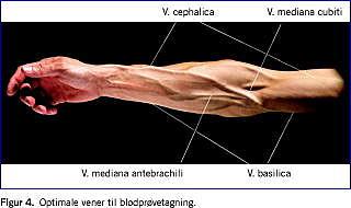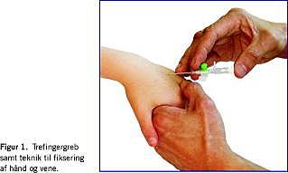 Patientens arm understøttes, og venen fikseres ved et let træk i huden (Figur 1 ).