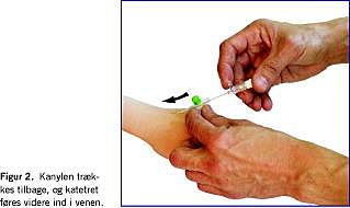 Når der ses blod i opfyldningskamret, er venen punkteret. For at sikre at selve katetret er beliggende i venen, fremføres kanyle og kateter samlet op til 5 millimeter. Indføringsvinklen sænkes nu, og kanylen trækkes lidt tilbage. Kanylen fastholdes i samme position i forhold til katetret, som føres videre frem. Staseslangen fjernes nu (Figur 2 ).
