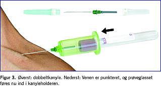 Kanylehætten fjernes, og venepunkturen foretages ved at kanylen indføres i en vinkel på 30-40°. Prøveglasset føres i bund i kanyleholderen, uden at denne forskubbes.