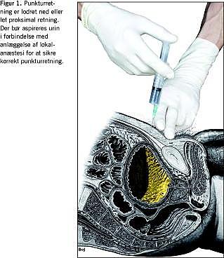 Infiltrationsanæstesi lægges fra hud til blærevæg på stedet for den forventede punkturkanal. Blæren punkteres og urin aspireres for at sikre korrekt lokalisation. Punkturretningen i forhold til huden er lodret ned eller en smule proksimalt (Figur 1).
