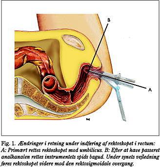 Rektoskopet indføres med obturator, velindsmurt i eksplorationscreme. Når skopet er ført gennem analkanalen (3-4 cm) fjernes obturatoren, og vinduet lukkes/påsættes, hvorefter skopet føres videre frem mod venstre og nedad og derefter fremad under synets vejledning og under hensyntagen til, at lumen primært findes anteriort i retningen mod venstre (Fig. 1 ). Er det primære formål med undersøgelsen tumordiagnostik, indblæses samtidigt luft for at bedre oversigten. Hele rectum, dvs. 18-20 cm, inspiceres. Den detaljerede inspektion af rektalslimhinden sker under tilbagetrækningen af skopet.