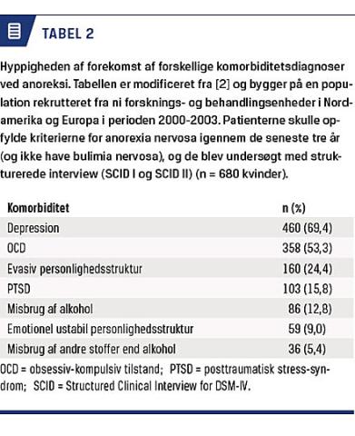 AN og andre psykiatriske sygdomme, herunder også de differentialdiagnostiske overvejelser, som det kan give anledning til. Ifølge en række studier er omfanget af komorbiditet ved AN meget stort. Der er fundet komorbiditet i helt op til næsten 90% af tilfældene. I Tabel 2 ses hyppighederne af komorbiditet inden for de store psykiatriske sygdomsgrupper [1]. De fleste publicerede behandlingsprogrammer er udformet til de rene diagnostiske udgaver af spiseforstyrrelser [1].