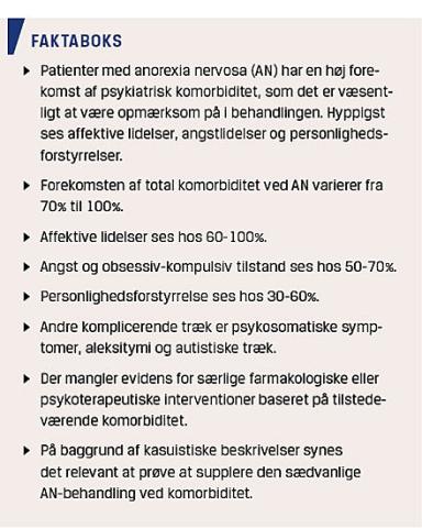 Der er forskellige holdninger til, hvor vigtigt det er at fokusere på vægtnormalisering af patienter med AN før behandling af komorbide tilstande såsom depression. Det skyldes, at mange af de symptomer, der synes at være tegn på psykiatrisk komorbiditet, i nogen grad kan skyldes den cerebrale effekt af underernæring [15, 7]. I NICE-retningslinjerne peger man dog på, at en række lægemidler kan anvendes til behandling af komorbide tilstande, men at der bør udvises stor forsigtighed pga. fysisk sårbarhed hos undervægtige patienter med AN [4]. Uden supplerende psykofarmakologisk