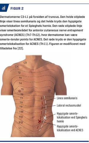Det patofysiologiske grundlag er ikke endeligt klarlagt. Hypotetisk skyldes smerterne en afklemning af de anteriore kutane grene fra en interkostalnerve (ramus cutaneus anterior nervus intercostalis) og efterfølgende isoleret relativ nerveiskæmi med neuropatisk smerte til følge [16, 17]. Interkostalnerverne forløber mellem m. transversus og m. obliquus internus, perforerer den posteriore rectusfascie, løber lateromedialt gennem rectusmusken, perforerer den anteriore fascie samt subcutis og afgiver sensoriske grene til cutis (Figur 1) [16]. Ud fra anatomiske betragtninger er risikoen for afklemning størst, hvor det neurovaskulære bundt passerer gennem rectusmusklens anteriore fasciekant, hvilket er et smerte-tender point [16] (Figur 1). Årsagen er ukendt, men hyppigst er den højre ramus cutaneus anterior nervus intercostalis ved Th11 involveret (Figur 2) [5, 6]. Derfor klager de fleste patienter over højresidige smerter i et lille område 3-4 cm kaudalt for umbilicus og 2-3 cm lateralt fra linea alba. Smerterne kan dog findes langs hele rectusmusklen med tender points fra Th7 til Th12 [5, 6]. Der vil meget sjældent være to ipsilaterale tender points, mens der hos 13% af patienterne forekommer bilateral ACNES