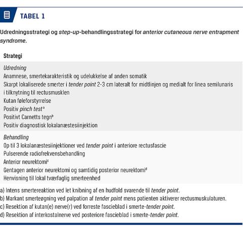 Behandlingsstrategien er baseret på en step-up-algoritme (Tabel 1B) [2, 5, 6, 8-12, 14, 15]. Er der begrundet mistanke om diagnosen, vil 20-30% af patienterne med ACNES have vedvarende analgetisk effekt efter op til tre LA-injektioner med 2-3 ugers interval [5, 6, 8, 9, 14]. Pulserende radiofrekvensbehandling (PRF) kan anvendes enten som et alternativ til LA-injektioner eller efterfølgende, hvis injektionerne ikke har tilstrækkelig effekt [6, 10]. PRF anvendes ikke som rutine i Danmark. Ved manglende effekt af LA-injektioner (og/eller PRF) tilbydes anterior neurektomi på tender point. Den analgetiske effekt efter en anterior neurektomi er elegant demonstreret i et nyligt publiceret, dobbeltblindet, randomiseret klinisk forsøg (sham-operation vs. neurektomi) [11]. Nerven/nerverne (oftest Th11 eller Th10) opsøges ved forreste fascieblad og reseceres optimalt lige før udtræden gennem fasciebladet. 60-70% af patienterne, der har ACNES og gennemgår en anterior neurektomi, vil opnå langvarig analgetisk effekt [11, 12]. Ved manglende analgetisk effekt efter isoleret anterior neurektomi tilbydes gentagen anterior neurektomi med henblik på identifikation af eventuelle oversete nerver. Hvis der ikke identificeres nogen nerver, opsøges nerverne ved bagerste fascieblad med henblik på posterior neurektomi. 50-60% af patienterne, der har ACNES og gennemgår reeksploration med anterior/posterior neurektomi, vil opnå analgetisk effekt [2].