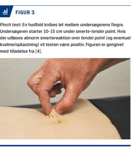 Der udføres tre kliniske undersøgelser med patienten vågen og i rygleje. Der undersøges først for føleforstyrrelser i huden (vatpind og spritswab) i et symmetrisk område omkring tender point. Ca. halvdelen af patienterne med ACNES vil have hypoæstesi for kulde og berøring i et centimeterstort område omkring tender point, men der kan også være allodyni, hyperalgesi eller hyperæstesi [1, 6, 18]. Herefter udføres der pinch test (Figur 3) hvor huden og underhuden knibes let (hudfoldstest) 15-20 cm i en linje under tender point. Der knibes let op forbi tender point mod kurvaturen, og på tender point vil der hos 78% af patienterne udløses kraftige smerter (positiv pinch test) [6, 8], og mange patienter vil få øjeblikkelig kvalme og nogle desuden opkastning (visceral refleks). Slutteligt udføres Carnetts test, som er det vigtigste kliniske indicium på ACNES. En finger placeres med et moderat tryk på tender point. Patienten bedes om at rejse hovedet og eventuelt løfte skuldrene fra underlaget, og hos 87% af patienterne udløser dette abnormt øget smerte i tender point (positivt Carnetts tegn) [3, 6, 20].