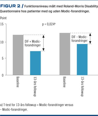 Det danske studie er et kohortestudie med 13-årsopfølgning, hvor langtidsprognosen for Modic-forandringer på rygsmerter og funktionsniveau blev evalueret. Samlet blev 204 patienter inkluderet og stratificeret afhængigt af forekomsten af Modic-forandringer ved inklusionen (39% med Modic-forandringer og 61% uden Modic-forandringer). Associationen mellem Modic-forandringer ved studiestart og nedsat fysisk funktion målt med Roland-Morris Disability Questionnaire (RMDQ), rygsmerter og sygefravær ved 13-årsopfølgningen blev analyseret. Der var ingen dataindsamling i den mellemliggende periode, og der blev ikke foretaget en kontrol MR-skanning ved 13-årsopfølgningen. I studiet fandt man ingen forskel i demografiske data, BMI, rygning, forbrug af antibiotika, ryg- og bensmerter ved baseline eller opfølgning. Fysisk funktion målt med RMDQ var ens i de to grupper ved baseline, men var statistisk signifikant bedre hos patienter med Modic-forandringer ved opfølgningen, nemlig 7,4 vs. 9,6 point (p = 0,024) (Figur 2). Derudover havde patienter med Modic-forandringer statistisk signifikant færre sygedage pga. rygsmerter ved 13-årsopfølgningen, 9,0 vs. 22,9 antal dage pr. år (p = 0,003). Konklusivt var Modic-forandringer hos patienter ikke negativt forbundet med forekomsten af rygsmerter eller funktionsniveau ved 13-årsopfølgningen.