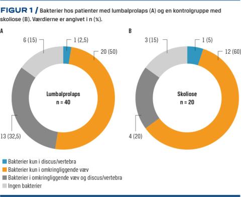 Undersøgelsen er et multicenterstudie med syv deltagende klinikker, hvor tilstedeværelsen af bakterier i disci blev evalueret i to forskellige patientgrupper. Patienter med lumbalprolaps og en medianalder på 43 år fik udtaget discus og vævsbiopsier i forbindelse med diskektomi pga. lænde- eller iskiassmerter. Disse biopsier blev sammenlignet med prøver fra ikkedegenererede disci hos unge skolioseopererede patienter (medianalder 17 år) uden rygsmerter eller discusprolaps. Analyserne blev udført ved hjælp af dyrkning og DNA-teknologi på to uafhængige universitetsklinikker i Göteborg og Uppsala. Der var ingen relevant forskel i bakterieforekomst i de to grupper. Der var heller ikke nogen sammenhæng mellem smerter i ryg/ben og fundet af bakterier (Figur 1). Den inkluderede kohorte bestod af 60 patienter, dvs. en forholdsvis lille sample size med kun 20 patienter i kontrolgruppen. 16S rRNA-baseret polymerasekædereaktionsanalyse blev anvendt til påvisning af bakterier. Det er uvist, om andre metoder kunne været benyttet for at øge specificiteten for påvisning af C. acnes. I den svenske undersøgelse konkluderede man, at fund af bakterier eller spor af bakterier, der er beskrevet i tidligere undersøgelser, sandsynligvis var et resultat af kontaminering under den kirurgiske proces.
