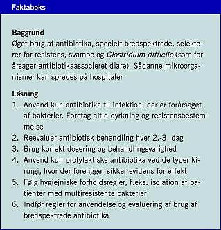 Antibiotika er vores basis for behandling af livstruende infektioner og anvendelse af moderne kirurgi med indsættelse af fremmedlegemer. Stigende resistensforekomst er den største trussel mod denne praksis. Selektion af resistens skyldes antibiotikaforbrug, og mangelfuld infektionshygiejne bidrager til spredning af resistente mikroorganismer. Antibiotikaforbruget er på danske sygehuse målt i DDD pr. sengedag steget med 50% i løbet af de seneste syv år. Vi står derfor over for en reel trussel om stigning i forekomsten af resistente bakterier eller svampe, og det risikerer at koste menneskeliv. Der må ufortøvet sættes ind over for misbrug af antibiotika på sygehusene og følges op med en styrkelse af infektionshygiejnen i alle dens aspekter, ikke mindst håndhygiejne og rengøring.