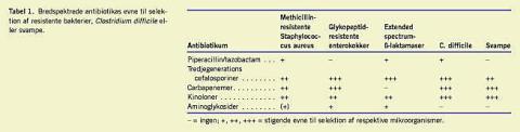 Samtidig med den stigende anvendelse af bredspektrede cefalosporiner, carbapenemer og fluorokinoloner (tilsammen en stigning på > 50% i årene 2000-2006 i Danmark) er der sket en markant stigning i MRSA, E. coli og Klebsiella spp. med extended spectrum- β-laktamaser, der er resistente over for de omtalte antibiotika. Nævnte antibiotika er påvist som selek-tionsfaktorer for sådanne bakterier. Næste trin er fremprovokering af panresistente stammer, dvs. bakterier som E. coli og Klebsiella sp. der er resistente over for samtlige kendte antibiotika, som f.eks. rapporteret fra Grækenland [9]. De bredspektrede antibiotika genkendes i øvrigt også som risikofaktorer for forekomsten af antibiotikaassocieret diare udløst af særlige smitsomme og aggressive kloner af Clostridium difficile [10].