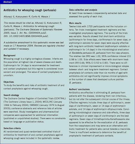 <li>Altunaiji S, Kukuruzovic R, Curtis N et al. Antibiotics for whooping cough (pertussis). The Cochrane Database of Systematic Reviews 2005, Issue 1. Art No. CD004404.pub2. DOI: 10.1002/14651858.CD004404.pub2.</li>