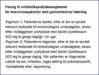 Bakteriel infektion er en hyppig komplikation hos patienter med dekompenseret leverlidelse. Særlig udsatte er patienter med levercirrose og gastrointestinal blødning. I studier er det vist, at op til 66% af de levercirrosepatienter, som indlægges med øvre gastrointestinal blødning, er bakterielt inficerede inden for en 14-dages-periode [1-6]. Det er ligeledes vist, at der er en statistisk signifikant uafhængig sammenhæng mellem tilstedeværelsen af bakteriel infektion, tidlig død og manglende blødningskontrol [7-9]. Disse registreringer rejser spørgsmålet om, hvorvidt denne patientgruppe kunne drage fordel af antibiotikaprofylakse, og i givet fald med hvilke typer af antibiotika og i hvor lang tid?