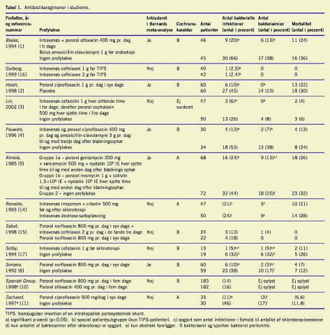 Der blev fundet 16 arbejder skrevet på baggrund af randomiserede kliniske forsøg. Arbejderne var studier, der sammenlignede antibiotikaprofylakse med enten placebo, ingen intervention eller et andet antibiotikum for at forebygge bakteriel infektion hos cirrosepatienter, indlagt med øvre gastrointestinal blødning. To arbejder forelå kun som abstrakter [10, 11]. Der er i 1999 af Bernard et al foretaget en metaanalyse inkluderende fem af disse studier og omhandlende i alt 534 patienter [12]. I en Cochrane-analyse fra 2003, foretaget af Soares-Weiser et al , i alt 15 arbejder vurderet og scoret ifølge kvalitetskriterierne i »The Cochrane Reviewers' Handbook «. Tre fik karakteren A, otte fik karakteren B, og frie fik karakteren C, hvorfor disse sidste ikke blev inkluderet i analysen [13]. De fire studier, der blev ekskluderet fra Cochrane-analysen, er ikke medtaget i vores gennemgang. Et studie fra 2002, foretaget af Lin et al , var ikke medtaget i Cochrane-gruppens vurdering, men indgår i vores gennemgang (Tabel 1 ) [3].