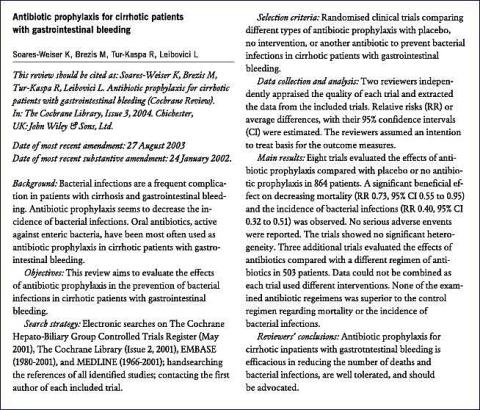 <li>Soares-Weiser K, Brezis M, Tyr-Kaspa R et al. Antibiotic prophylaxix for cirrhotic patients with gastrointestinal bleeding. (Cochrane review) I: The Cochrane Library, Issue 3, 2004. Chichester, UK: John Wiley & Sons, Ltd.</li>