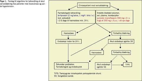 Vi har tidligere [2] foreslået en behandlingsalgoritme for variceblødning hos cirrosepatienter inklusive antibiotikaprofylakse (Figur 1 ). De foreliggende to Cochrane-analysers resultater [1, 4] ført ud i klinisk praksis indebærer farmakologisk behandling (terlipressin, 2 mg som bolus, herefter 1 mg hver fjerde time i.v.) straks ved mistanke om variceblødning samtidig med volumenerstatning af blodtab (blod, plasma, plasma-expander og evt. saltvand). Der gives samtidig profylaktisk behandling med antibiotika i syv dage (for eksempel ciprofloxacin 400 mg ×2 i.v. og peroral 250 mg × 3, så snart dette er muligt for patienten) samt frisk frosset plasma og/eller trombocytter ved behov. Behandling med terlipressin fortsætter i mindst 48 timer, eller til der har været hæmostase i 24 timer. Ved blødning trods terlipressin foretages der diagnostisk og/eller terapeutisk endoskopi, evt. anlægges der Sengstaken-sonde. Efter hæmostase overgår patienten til sekundær profylakse [5]. Fornyet blødning bør medføre fornyet endoskopi og/eller anlæggelse af Sengstaken-sonde samt overvejelser om anlæggelse af transjugulær intrahepatisk portosystemisk stent.
