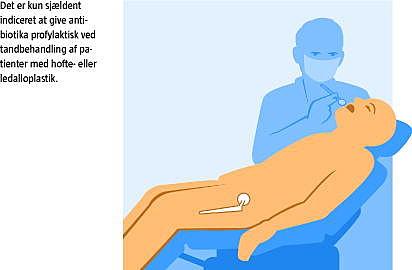 Summary Antibiotic prophylaxis in relation to dental treatment of patients with hip or knee joint prosthesis is seldom necessary Ugeskr Læger 2010;172(46):3170-3173 A review of the literature with respect to whether antibiotic prophylaxis should be recommended in relation to dental treatment of patients with hip or knee joint prosthesis. We find no evidence for such a general recommendation. As neutropenic patients and patients with rheumatoid arthritis are generally more prone to develop periprosthetic infections it can be considered in these cases to give prophylactic antibiotics before more extensive dental treatments.