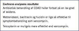 Det systematiske review viste, at metronidazol, bacitracin og fucidin var lige så effektive til symptombehandling som vancomycin [1]. Teicoplanin viste en tendens til at være mere effektivt end vancomycin (relativ risiko (RR) 1,21, 95% sikkerhedsinterval (SI) 1,00-1,46) (p = 0,06). Hvad angik initial symptombehandling, var vancomycin i et enkelt arbejde [9] mere effektivt end placebo (RR 6,75; 95% SI 1,16-48,43) (p = 0,03), men dette resultat bør dog tolkes med forsigtighed, som omtalt i diskussionen. Teicoplanin var mere effektivt end vancomycin, når målet var at opnå en negativ C. difficile-fæcesdyrkning og/eller toksintest (RR 1,82, 95% SI 1,19-2,78) (p = 0,006), metronidazol var lige så effektivt, og fucidin var mindre effektivt (RR 0,08, 95% SI 0,01-0,54) (p = 0,01) end vancomycin. Til at opnå primært bakteriologisk respons var vancomycin mere effektivt end placebo (RR 7,5, 95% SI 1,16-48,43) (p = 0,03), og teicoplanin var mere effektivt end vancomycin (RR 1,43, SI 1,14-1,81) (p = 0,002). Metronidazol, fucidin og rifaximin var lige så effektive som vancomycin. Endelig var bacitracin mindre effektivt end vancomycin (RR 0,52, SI 95% 0,32-0,84) (p = 0,008), hvad angår bakteriologisk respons.
