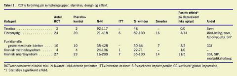 Den systematiske gennemgang af litteraturen indikerer, at antidepressiva har en vis effekt ved behandlingen af somatoforme tilstande og funktionelle syndromer [18]. Undersøgelserne er præget af forskellig størrelse og indfaldsvinkel. Inklusions- og eksklusionskriterierne er ikke altid beskrevet. Randomiseringen og blindingen er af meget varierende kvalitet. Der er kun anvendt intention-to-treat -princippet ved ganske få analyser, hvilket betyder, at resultaterne må tages med et vist forbehold. Dette er især af betydning ved denne gruppe patienter, der ofte har en betydelig skepsis over for en behandling, der kunne antyde tilstedeværelsen af en psykisk komponent.