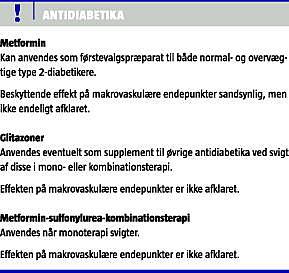 Metfomin har været anset som førstevalg specielt hos overvægtige T2D-patienter pga. dets effekt på CVD-risikoen i UKPDS [9]. Årsagen til den observerede effekt er primært tilskrevet gunstige virkninger af metformin. UKPDSs data er ligeledes blevet tolket som dokumentation for, at SU- samt insulinbehandling ikke øger CVD-risikoen. Det kan dog ikke udelukkes, at en mulig øget CVD-risiko, der er betinget af hyperglykæmi ved konventionel (diæt) behandling, udjævnes (men ikke elimineres) af et højere (suprafysiologisk) plasmainsulinniveau og/eller hæmning af kaliumkanaler i hjertet ved insulin- og/eller SU-terapi. Det er således muligt, at metformins »beskyttende« effekt på CVD i UKPDS primært skyldes blodglukosesænkningen samt, at metformin ikke per se øger CVD-risikoen. Det skal dog understreges, at der »netto« ingen holdepunkter er for, at insulin og/eller insulinsekretagoger per se øger risikoen for CVD og, at disse behandlinger har en vigtig rolle i behandlingen af mikrovaskulære komplikationer. De aktuelle data fra ti års opfølgning efter UKPDS antyder faktisk, at behandling med SU/insulin reducerer CVD-risikoen samt, muligvis modsat metformin, også risikoen for mikrovaskulære komplikationer. Metformin og SU/insulin kan derfor muligvis være ligeværdige førstevalg hos T2D [15].