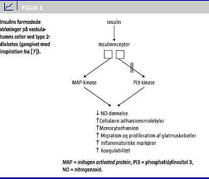 I karvæggen er insulin vist at aktivere mulige både aterogene og antiaterogene processer [7, 8]. Ved insulinresistens i karvæggen kan antiaterogene pathways svækkes ved en hæmning af phosphatidylinositol 3-kinase (PI3-kinase) (Figur 1 ). Samtidig kan et kompensatorisk forhøjet insulinniveau pga. insulinresistens aktivere mulige aterogene signaleringsveje, heriblandt mitogen activated protein -kinase (MAP-kinase) (Figur 1).