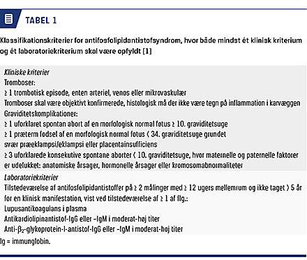 sionskriterier, og i kun et af dem opfyldte patienterne de nuværende kriterier for APS. Effekten af behandling af obstetrisk APS er positivt vurderet inkonsistent, men negativt vurderet vildledende. Det er nødvendigt med studier, hvor man følger internationalt accepterede kriterier og benytter standardiserede laboratorietest [14].